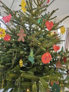 Anschließend durften die Kinder den Weihnachtsbaum im Speisesaal schmücken. Neben ihrem selbst gebastelten Schmuck fand auch der Christbaumschmuck der Kindergartenkinder aus Escherndorf sowie unserer Seniorinnen und Senioren dort seinen Platz.