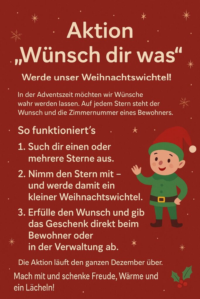 In der Adventszeit möchten wir unseren Bewohnern und Bewohnerinnen eine besondere Freude bereiten. Unsere Wunschsterne hängen bereit – und jeder Stern trägt einen kleinen Herzenswunsch. So einfach geht’s: Einen Stern aussuchen, Wunsch erfüllen und das Geschenk in der Verwaltung oder direkt beim Bewohner abgeben. Gemeinsam lassen wir so viele kleine Weihnachtswünsche wahr werden. Es sind […]